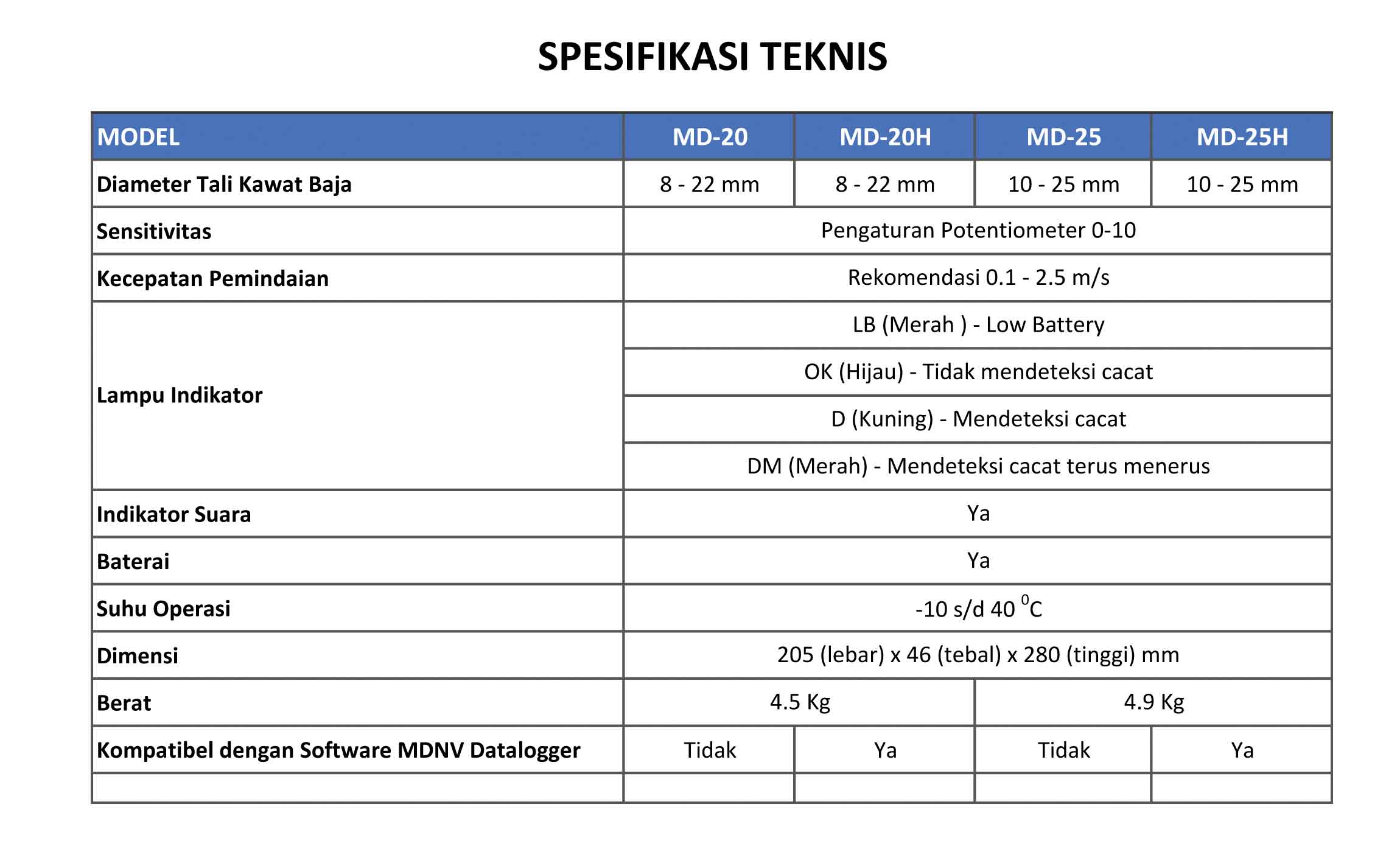 Alat uji Wire Rope tipe MD-20 dan MD-25 menggunakan metode magnetik dengan sensor deteksi. Alat berdimensi ringkas (205 x 243 x 46mm) dan berat kurang dari 5 kg sehingga dapat dioperasikan dengan mudah oleh 1 orang operator. Alat ini dilengkapi indikator audio dan visual ketika mendeteksi cacat untuk memudahkan operator mengetahui, menemukan dan menentukan posisi cacat. Alat ini dapat dilengkapi dengan software untuk menyimpan data hasil inspeksi.