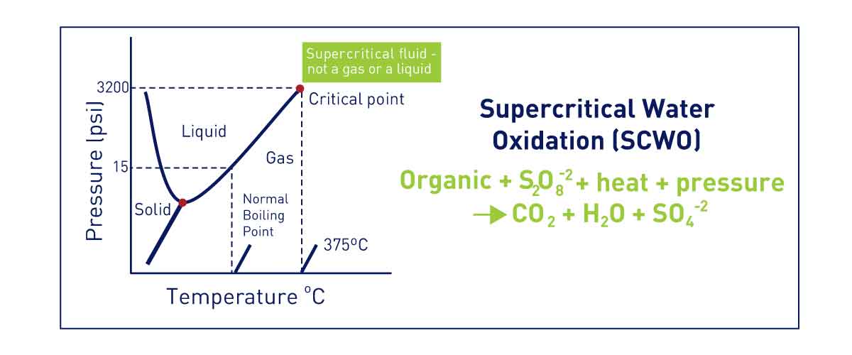 Sievers InnovOx TOC Analyzers employ a unique supercritical water oxidation approach to oxidation that uses both heat and pressure. In a sealed reactor, the sample and persulfate are heated to 375 °C (770 °F). This high temperature and corresponding increased pressure of 22.1 MPa (3,200 psi), allows for the supercritical state to be achieved, and dramatically improves the efficiency of the oxidation process, thereby offering better recovery for difficult matrices. As an added benefit, inorganic salts are no longer soluble at these conditions, and therefore do not interfere with the oxidation reaction.